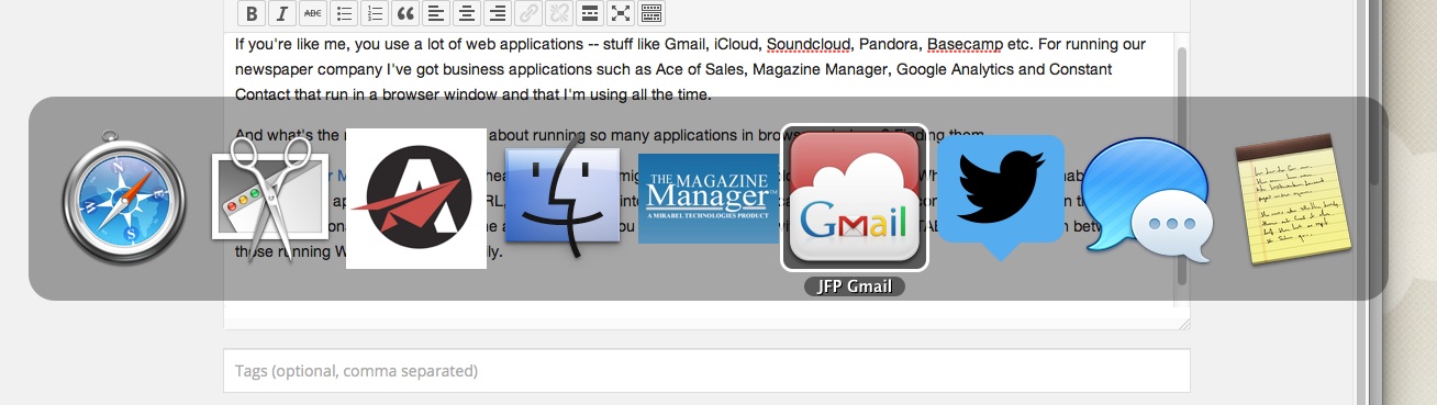 If you’re like me, you use a lot of web applications — stuff like Gmail, iCloud, Soundcloud, Pandora, Basecamp etc. For running our newspaper company I’ve got business applications such as Ace of Sales, Magazine Manager, Google Analytics and Constant Contact that run in a browser window and that I’m using all the time.